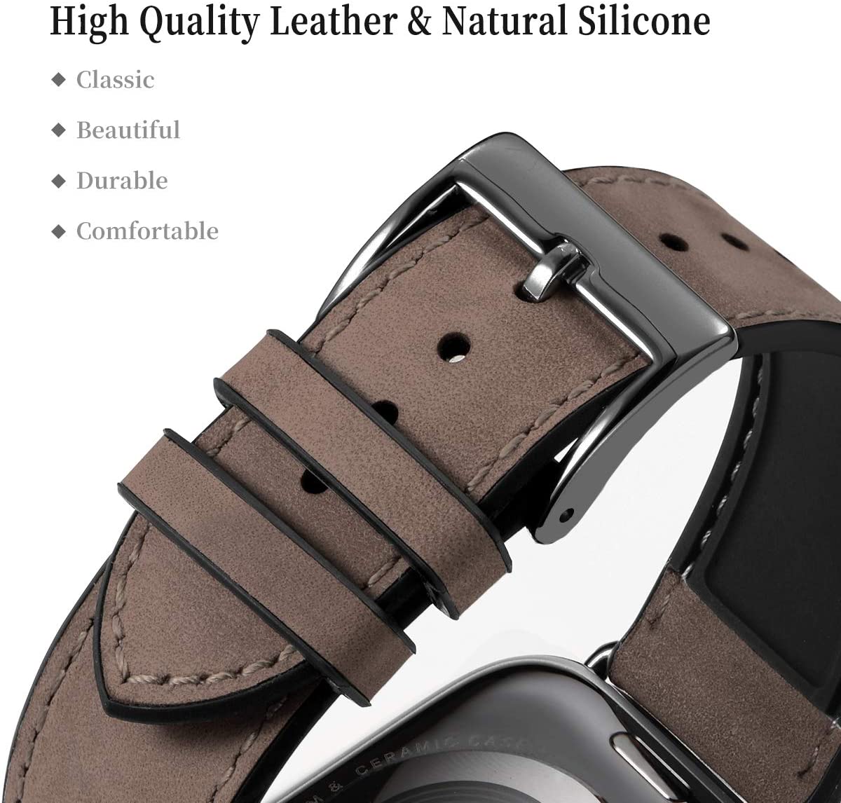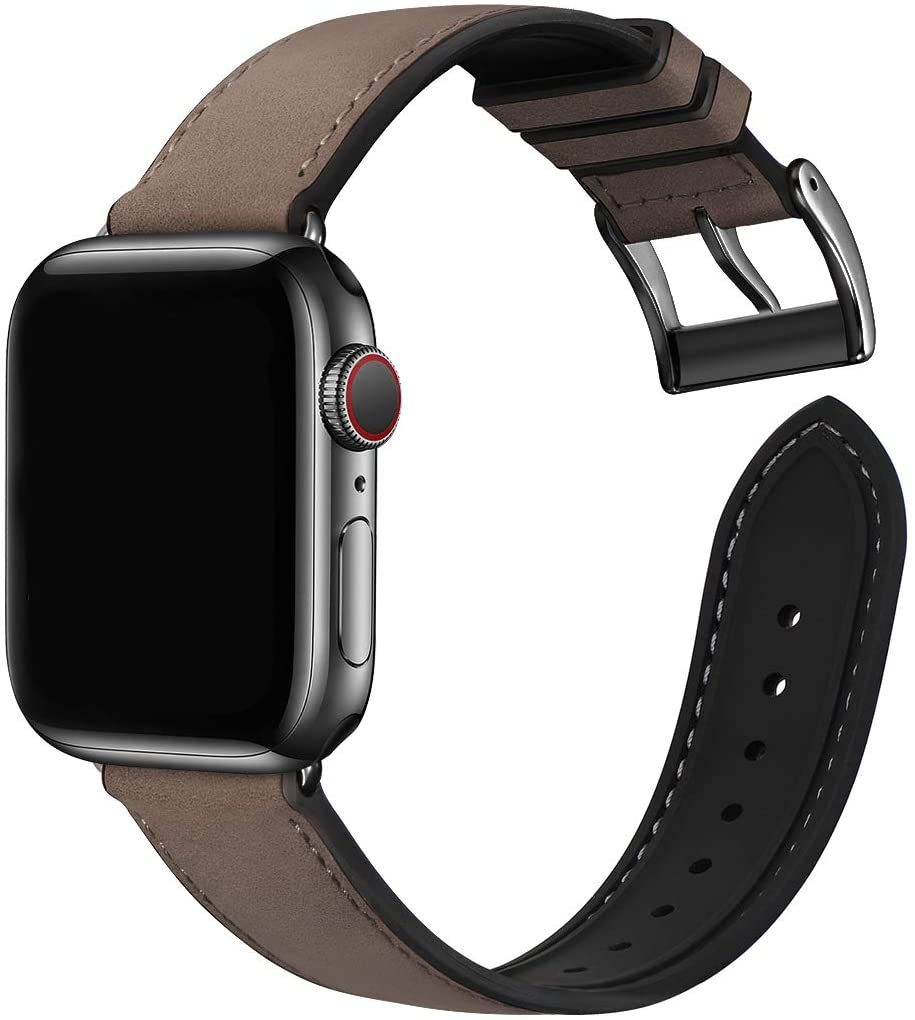 The watch band’s outer surface is made of high-quality genuine leather and the back is nature black silicone rubber. It is a hybrid sweatproof strap, comfortable and lightweight to wear.